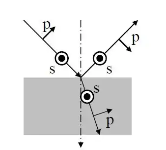 - عندما يكون ورود الضوء مائلاً على سطح ما، تكون استجابته متعلقة بالاستقطاب. يمثل الضوء الوارد والصادر على السطح باستقطابين متعامدين. يمثل الشكل إلى اليسار هدين الاستقطابين، حيث p (أو TM في الكهرطيسية) يمثل الحقل الكهربائي الموازي لمستوي الورود، و s (أو TE) الحقل الكهربائي الناظمي على مستوي الورود.
