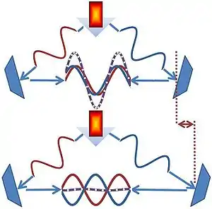 ويستخدم لإجراء التداخل شعاع ضوء ذو طول موجة معينة وبالتالي تردد معين (أي شعاع الليزر). ينقسم هذا الشعاع عند مروره بمرآة نصف شفافة، حيث ينعكس جزءا من الشعاع على المرآة بينما يواصل جزء الشعاع الآخر مسيرته في خط مستقيم. ويواصل كل من الشعاعين مساره حتى يعودان للالتقاء سويا عند رأس المقياس Detector. ونظرا لاختلاف طول مساري الشعاعين يحدث فارق في طور الشعاعين عند الالتقاء.ويعين هذا الفرق في طور الشعاعين منظومة أو شكل التداخل الناتجة. ونظرا لكون الشعاع الأصلي ذو طول موجة معينة فإن حدوث تغير في الطور بينهما معناه تشخيص لشيئ قد حدث خلال مساري الشعاعين وأدى إلى هذا الفرق عند الالتقاء. قد ينشأ هذا الفرق من اختلاف في طول المسارين أو يمكن أن يكون معامل الانكسار على مسار أحدهما بسبب وجود مادة مختلفة هو السبب في حدوث فرق الطور بين الشعاعين.