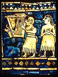شخص يحمل قيثارة مرسوم في لوحة الحرب والسلم السومرية.