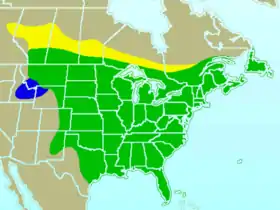![]() خريطة انتشار القيق الأزرق بالولايات المتحدة الأمريكية وكندا الأصفر:التزاوج فقط، الأخضر: الاستقرار كامل السنة، الأزرق: الإشتاء فقط | |