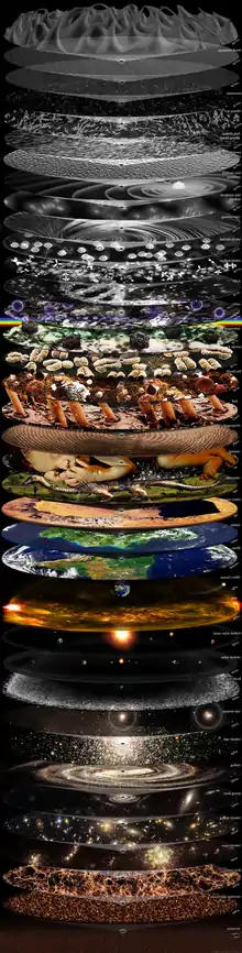 | الأجسام دون الذرية | – | 10−35 | ℓP | رغوة كمية |