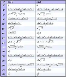 جميع قيم الجيب، وجيب التمام، وظلال الزوايا متزايدة بـ 3° يمكن تعبير عنها بدلالة الجذور التربيعية، باستخدام المتطابقات (متطابقة نصف الزاوية، ومتطابقة ضعف الزاوية، ومتطابقة إضافة/طرح الزاوية) وباستخدام القيم لـ 0° و 30° و 36° و 45° . بالنسبة لزاوية عدد صحيح بالدرجات التي ليست مضاعفة لـ 3° ( π60 راديان)، لا يمكن التعبير عن قيم الجيب وجيب التمام والمماس بدلالة الجذور الحقيقية.