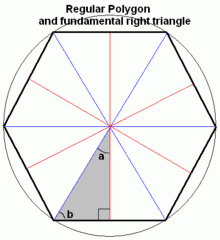 هنا تستخدم المثلثات القائمة التي أنشئت من قِطَع التناظر للمضلعات العادية لحساب النسب المثلثية الأساسية. يمثل كل مثلث قائم ثلاث نقاط في مضلع عادي: الرأس، مركز الحافة الحاوية لهذا الرأس، ومركز المضلع. يمكن تقسيم مضلع ذو n ضلعًا إلى 2n مثلثات قائمة ذات زوايا 180n، و 90 − 180n، و 90° ، من أجل n = 3 , 4 , 5 , ....