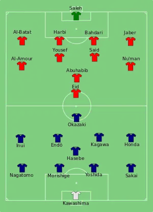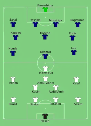 كان من المفترض أن يكون شينجي أوكازاكي، والذي يعتقد أنه على قائمة العديد من أندية الدوري الإنجليزي الممتاز هذا الشتاء، قد ضاعف من تقدم اليابان بعد 33 دقيقة لكنه أهدر ضربة رأسية حرة مما جعل العراقييين على مسافة هدف واحد بدخول نصف الوقت من المباراة. بعد دقيقتين من بداية الشوط الثاني، بدأ هوندا من حيث توقف في الشوط الأول وسدد كرة قوية بقدمه اليمنى الأضعف من مسافة 20 ياردة لتصطدم بالقائم العرضي، وحصل هوندا على أفضل فرصة في الدقيقة 64 كان من المفترض أن تحسم الفوز لصالح منتخب اليابان ولكن انتهت المباراة بنفس النتيجة.[21]