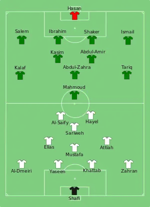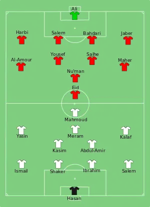 في حين استحوذ العراق على الفترة الأولى من المباراة فقد وجدوا أن حارس منتخب فلسطين توفيق علي واثقاً ولا يظهر أي علامات للتوتر في بدايته الأولى. حارس المرمى البالغ من العمر 24 سنة تصدى لمجهود طويل من اللاعب وليد سالم في الدقيقة 20 من المباراة قبل أن يقفز الحارس إلى يمينه لاعتراض رأسية اللاعب يونس محمود ليمنعه من التسجيل قبل خمس دقائق من نهاية الشوط الأول. واستمرت إضاعة العراق للفرص في الدقيقة الثانية فقط من بداية الشوط الثاني، عندما سدد محمود كرة بعيدة كان قد مررها إليه اللاعب ياسين إلى الخلف عندما وجده بداخل منطقة الجزاء. لكن المتاعب التي سببها المهاجم أمام المرمى استمرت لدقيقة أخرى. جاءت ركنية من اللاعب البديل علي عدنان ليرتفع محمود إلى أعلى ويسدد رأسية قوية إلى جانب الحارس توفيق علي. بعد تلك الانتكاسة مباشرة، كان لدى فلسطين أفضل فرصة لها في تلك الليلة عندما وصلت تمريرة سيئة من سلام شاكر إلى نعمان لكن جلال حسن أبعد الكرة بطريقة رائعة بقدميه لمنع إحراز الهدف.[31]