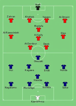 ومع ذلك، أظهرت خطط الأردن قصورا كبيراً بعد 10 دقائق فقط عندما هز تاكاشي إينوي الشباك بواسطة التمريرة الخلفية من قبل اللاعب كاغاوا لكن الحكم المساعد على الجانب القريب قرر أن الكرة قد تجاوزت الخط قبل التمرير من قبل لاعب خط وسط نادي بوروسيا دورتموند. لكن منتخب اليابان أخذ زمام المبادرة في منتصف الشوط الأول فبعد أن تمكن حارس مرمى المنتخب الأردني عامر شفيع من التغلب فقط على ركلة شينجي اوكازاكي المنحنية بعد التمريرة الذكية من اللاعب اينوي عبر المرمى، كان اللاعب هوندا جاهزا للتسجيل من زاوية ضيقة. على الرغم من ذلك إلا أن الحارس الأردني شفيع حرم حامل اللقب من إحراز هدفه الثاني بعد خمسة دقائق عندما أظهر حارس مرمى المنتخب الأردني استجابة رائعة ليقوم بدفع الرأسية المباشرة لماساتو موريشيغي من ركنية هوندا القوية لتعبر الكرة فوق العارضة حيث واصلت اليابان الاستحواذ على الكرة وتقييد حركة خصومها إلى أبعد حد . في محاولة لتجنب الهزيمة على الأقل، تم استدعاء المهاجم أحمد هايل ولاعب الوسط منذر أبو عمارة بعد منتصف المباراة لصالح الأردن، وظهر أثر هذه الخطوة عندما بدأ فريق ويلكينز الشوط الثاني بحيوية ونشاط بعد أن استحوذت اليابان على ما يقرب من 75 في المائة من الكرة في النصف الأول.[25]