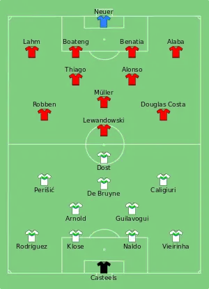 كان مدرب بايرن ميونخ في المباراة هو الإسباني جوسيب غوارديولا[4]، أما مدرب فولفسبورغ فكان الألماني دييتر هيكينغ.[5] ضغط بايرن ميونخ على دفاعات فولفسبورغ، وسجل الجناح الهولندي آريين روبن الهدف الأول لبايرن ميونخ بعد تمريرة من لاعب الوسط البرازيلي دوغلاس كوستا في الدقيقة 49.