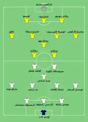 لعب نهائي كأس العالم 2002 بين ألمانيا والبرازيل على ملعب يوكوهاما الدولي في يوكوهاما، اليابان،[140] فكانت هذه المباراة أول مواجهة بين الفريقين في تاريخ بطولات كأس العالم، واستطاع منتخب البرازيل الفوز بنتيجة 2-0 لتفوز باللقب الخامس، بهدفين سجلهما رونالدو.[141] شهدت المباراة الظهور الثالث على التوالي لكابتن المنتخب البرازيلي آنذاك كافو في نهائي كأس عالم، وهو إنجاز لم يسبق لأحد تحقيقه في تاريخ بطولات كأس العالم.[142]