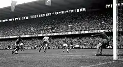 أقيم نهائي كأس العالم 1966، على ملعب ويمبلي في العاصمة الإنجليزية لندن، وبحضور 96,924 متفرج،[65] في أكبر محفل رياضي في تاريخ بريطانيا، في لقاء جمع بين المنتخبين الإنجليزي والألماني الغربي بتاريخ 30 يوليو عام 1966.[66] واستطاع المنتخب الإنجليزي الفوز على منتخب ألمانيا الغربية بنتيجة 4-2 في الوقت الإضافي، بعد انتهاء الوقت الأصلي بالتعادل 2-2.[67] حيث سجل جيوف هورست هدف الفوز في الأشواط الإضافية، يذكر أن التقنية الحديثة استخدمت لتأكيد صحة الهدف،[68] لكن التحليل أظهر عدم صحة الهدف، حيث لم تتجاوز الكرة كامل محيطها.[69]
