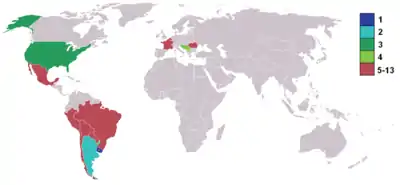 | 3 | الولايات المتحدة | 2 | 0 | 1 | 4 | 7 | 6 | 1 |
