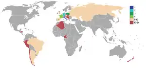 | 24 | السلفادور | 0 | 0 | 3 | 0 | 1 | 13 | 12- |