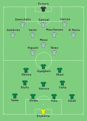قرر رئيس الاتحاد النيجيري لولو ساني رصد مكافئات للاعبي منتخب بلاده إذا استطاعوا التغلب على منتخب الأرجنتين خصوصا أن المباراتين التين سبق أن تواجها معا انتهت بفوز الأخير 2-1 في 1994 و1-0 في 2002 [15] وقد قال نوانكو كانو : ”الأرجنتين تمتلك لاعبين كبار والجميع يحترمونهم. نحن أيضًا نُقر بأنهم لاعبين ممتازين وعظماء لكن الأرجنتين بالتأكيد تبادلنا الاحترام لأنهم يعرفون قيمة فريقنا وأن لدينا الكثير لنقدمه في أي وقت. بالفعل ستكون مباراة صعبة للغاية لكن أعتقد أننا قادرين على تحقيق الفوز. إنه كأس العالم وأي شيء ممكن الحدوث. أنتم تعلمون أن النتيجة تكون متقاربة عندما نواجههم في المحافل الكبرى. أتوقع أن تكون النتيجة 2-1 أو 1-0 يوم السبت وسيكون الفوز من نصيبنا“ [16] بينما قال المهاجم أوبافيمي مارتينز : ”الناس يتحدثوا عن ميسي كثيراً، وينسون وجود لاعبين مميزين مثل تيفيز وميليتو. من المهم لنا مواجهتهم جميعاً على المستوى الفردي والتقني، ونحن لدينا لعبتنا الخاصة كذلك مع نجوم نمتلكهم“ [17] وفي المقابل في أرسل مارادونا تحديا للجميع بقوله : ”أعد الأرجنتينيين بمشاهدة فريقهم في سبع مباريات في كأس العالم، إن الفوز على مثل هذا الفريق يتطلب اللعب باثنين وعشرين لاعبا، لأن لاعبي المنتخب الأرجنتيني مستعدون للتضحية بحياتهم هنا“ [18] بينما أرسل مدرب الأحمال فرناندو سينوريني اتهاما إلى الاتحاد الدولي لكرة القدم قائلا : ”الفيفا قلقون بشأن المنشطات، لكنهم لا يأبهون على الإطلاق عندما يشارك اللاعبون في 70 مباراة في السنة بجانب ترحالهم من مكان لمكان لخوض المباريات“.[19] قال قلب الدفاع نيكولاس بورديسو : ”أعتقد أن البدء بانتصار وأداء مميز أمر غاية في الأهمية، هناك الكثير من الإثارة والقلق والبداية بـ3 نقاط يعني الكثير“.[20] بدأت المباراة في الساعة الرابعة بالتوقيت المحلي. أسفر الضغط الأرجنتيني في الدقيقة السادسة عن الهدف الأول عبر ركلة ركنية نفذها لاعب خط الوسط المُخضرم خوان سيباستيان فيرون من الجهة اليُمنى للمنتخب الأرجنتيني لتصل إلى مدافع مرسيليا القادم من الخلف غابريل هاينزه والذي سدد كرة رأسية من الوضع طائرًا وجدت طريقها إلى أقصى الزاوية اليُمنى لحارس النيجيري فانسون إنياما ولم يستطع الظهير الأيمن والمتمركز عند القائم الأيمن تشيدي أودياه اعتراض طريقها برأسه لتنتهي المباراة بهذه النتيجة.[21] بعد انتهاء المباراة قال مارادونا : ”الحمد لله أننا فزنا وإلا فالندم سيكون كبيرًا على الفرص الكثيرة التي ضاعت، صنعنا عديد الفرص لكن لم نترجمها لأهداف وكان يمكن أن نخسر الفوز بأي هجمة معاكسة أو كرة خاطئة. منحت تعليمات لجميع المهاجمين لكن رغم هذا لم نتمكن من ترجمة الفرص لأهداف وبالتالي لم تخرج المباراة بالنتيجة التي تُظهر كيفية أدائنا خلالها لكن علينا ألا ننسى كذلك تفوق الحارس النيجيري، المهم أننا حققنا الانتصار لأن هذا يمنحنا الهدوء اللازم للاستعداد للمباريات القادمة“ [22] بينما قال قائد منتخب الأرجنتين خافيير ماسكيرانو : ”أعتقد أن المباراة الأولى في المونديال دائمًا ما تكون صعبة خاصة حين تلعب أمام فريق قوي مثل نيجيريا، أعتقد أننا لعبنا مباراة جيدة ويجب أن نُواصل على هذا النهج بتحقيق الانتصارات في مثل هذا النوع من المباريات، وعلينا أيضًا أن نُطور من قدراتنا ومستوانا. المنافس تميز بالقوة البدنية والاندفاع وكذلك تحسن أداءهم كثيرًا بعدما تقدمنا حيث أرادوا التعديل وبالتالي امتلكوا رغبة أكبر، تيفيز ودي ماريا لم يكونا في المستوى صحيح لكنهم ساعدانا كثيرًا وساعدا ميسي وفيرون في تحركاتهما وعمومًا.. المهم أن يكون أداءنا جماعي ويتطور مستقبلًا“.[23] وفي المقابل قال لاغرباك : ”هناك شعور بخيبة الأمل بسبب النتيجة لأننا لم نستحق الخسارة، لقد تدربنا جيدًا خلال الأيام الماضية وأضعنا عدد من الفرص في المباراة ولكن لا ننسى أنهم فريق يمتلئ بالنجوم الكبار. لسوء الحظ كان هناك خطأ دفاعي من جانبنا أدى للركلة الركنية، الدفاع أ
