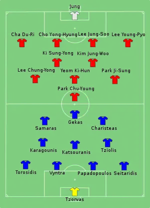 قبل ركلة البداية لمباراة كوريا الجنوبية واليونان تعرض المدافع اليوناني فانجيليس موراس للإصابة [7] مما أجبر ريهاغل على اشراك أفرام بابادوبولوس ثم تعرض 3 لاعبين من منتخب اليونان وهم جيورجيوس ساماراس، أنجيلوس خاريستياس، وسوتيريس نينيس لسرقة ما مقداره 2000 يورو.[8] وفي الجانب المقابل فإن أكبر مشاكل المدرب مو هي عدم اكتمال اللياقة البدنية للمهاجم لي دونغ غوك ولاعب الوسط بارك جي سونغ.[9] صرح المدافع الشاب لي جونغ سو قائلا «أعتقد أنه يتوجب علينا التغلب على اليونان من أجل تعزيز تأهلنا إلى الدور الثمن النهائي حيث سنكون مركزين على تحقيق نتيجة الفوز فقط».[10] عندما بدأت المباراة استطاعت كوريا الجنوبية أن تفاجئ أبطال أوروبا 2004 بهدفين لتحصد أولى نقاطها في البطولة. نجح لي يونغ سو في تسجيل الهدف الأول في الدقيقة السابعة عبر ركلة ثابتة قريبة للغاية من راية الركلة الركنية على يمين مرمى المنتخب اليوناني نفذها كي سونغ يونغ لتصل إلى لي تشون سو الذي وضع الكرة في الشباك من مسافة قريبة. في الدقيقة 52 استطاع بارك جي سونغ الضغط على المدافع اليوناني لوكاس فينترا الذي استلم تمريرة من زميله فاسيليس توروسيديس في المناطق الدفاعية لليونان لينطلق بسرعة كبيرة للغاية متجاوزًا فينترا وأفرام بابادوبولوس قبل أن يضع الكرة من أسفل الحارس أليكساندروس تزورفاس لتذهب إلى الشباك معلنًا عن الهدف الثاني للمنتخب الكوري الجنوبي.[11] بعد المباراة قال بارك جي سونغ ‹‹إنه لشرف أن يتم اختياري كأفضل لاعب، أنا سعيد جداً لأننا حققنا الفوز في هذه المباراة خاصة أنها أول مباراة في أفريقيا›› أما المدرب مو فقد قال ”لم تكن المباراة سهلة فليس هناك مباراة سهلة في كأس العالم والآن سنحاول بذل جهدنا في المباريات المقبلة لمحاولة التأهل. جميع اللاعبين كانوا مدهشين اليوم وأنا سعيد جداً“ [12] أما في الجانب اليوناني فقد قال ساماراس ’بالنسبة لكوريا نعم هم فريق جيد، لكننا خسرنا بسبب أخطاءنا نحن فقد سمحنا لهم بالتسجيل ولم نستغل فرصنا ولم نستغل كذلك عدد كبير من الركنيات سنحت لنا‘ [13] أما ريهاغل فقد قال ”لقد كان بإمكاننا أخذ التقدم والريادة لكننا فشلنا في التسجيل، ثم تلقينا هدف من كرة ثابتة لأننا لم نكن حذرين فكان هناك كثير من اللاعبين لم يقوموا بإبعاد الكرة. نحن كنا نعرف أن الكوريين سريعين جداً وأنهم يقاتلوا على الكرة حتى النهاية، لقد حاولنا التفوق على هذا لكننا لم ندخل في أجواء المباراة وقد كنا غير محظوظين في تبديلين قمنا بهما. لقد كان فوزاً مستحقاً لكوريا“.[14]