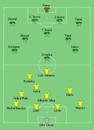 - "Tactical Line-up – Group G – Brazil-Cote d´Ivoire" (PDF). FIFA.com. Fédération Internationale de Football Association. 20 June 2010. مؤرشف من الأصل (PDF) في 4 مارس 2016. اطلع عليه بتاريخ 20 يونيو 2010. الوسيط