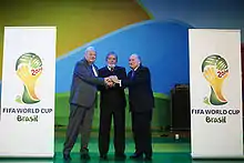 فازت البرازيل بحق استضافة هذا الحدث يوم 30 أكتوبر 2007 بوصفها البلد الوحيد الباقي للدخول في المزايدة.[20] البرازيل لديها بالفعل شعار كأس العالم وهو تصميم يحاكي شكل كأس العالم ويتألف من ثلاث أياد التي تجتمع على شكل كرة. ولها ألوان الأخضر والأصفر، ولكن هناك أيضاً شعار يتضمن الأحمر والأزرق، كما في العلم الوطني للبرازيل.[21]