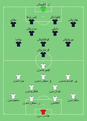 |CitationClass=تم تجاهله (مساعدة) - "Tactical Line-up – Group D – Iceland v Croatia" (PDF). FIFA.com. Fédération Internationale de Football Association. 26 يونيو 2018. مؤرشف من الأصل (PDF) في 15 سبتمبر 2018. اطلع عليه بتاريخ 26 يونيو 2018. الوسيط