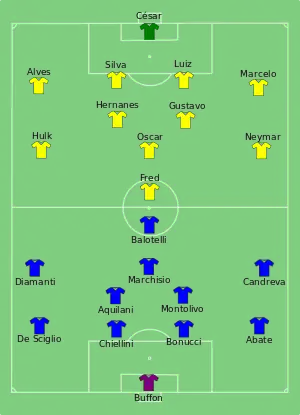 |CitationClass=تم تجاهله (مساعدة) - "Tactical Line-up – Group A – Italy-Brazil" (PDF). FIFA.com. Fédération Internationale de Football Association. 22 June 2013. مؤرشف من الأصل (PDF) في 03 مارس 2016. اطلع عليه بتاريخ 22 يونيو 2013. الوسيط