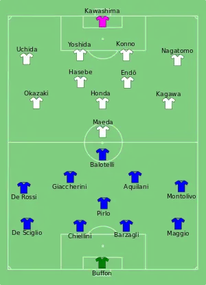 |CitationClass=تم تجاهله (مساعدة) - "Tactical Line-up – Group B – Italy-Japan" (PDF). FIFA.com. Fédération Internationale de Football Association. 19 June 2013. مؤرشف من الأصل (PDF) في 05 مارس 2016. اطلع عليه بتاريخ 19 يونيو 2013. الوسيط