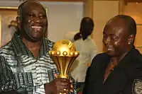 لوران غباغبو رئيس جمهورية ساحل العاج (يسار) وعبيدي بيليه (يمين) لاعب منتخب غنا السابق يحملان كأس الأمم الأفريقية في 2007