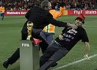 تأهل منتخبي أسبانيا و هولندا الي نهائي البطولة. وقبل مباراة النهائي المحددة في 11 يوليو 2010 حاول أحد المشجعين الإسبانيين سرقة الكأس وهذه كانت المحاولة الأولى لسرقة كأس بطولة كأس العالم بعد 27 عامًا من سرقة كأس جول ريميه.وقام خاومي ماركيت كوت الذي يطلق على نفسه اسم "جيمي جامب" وهو مغامر مهووس بالشهرة مشهور بالركض في الملاعب بذلك وفرضت عليه غرامة مالية قدرها 260 دولار بعد إدانته بالتعدي على ممتلكات الغير ومحاولة سرقة كأس العالم.وجرى كوت داخل الملعب قبل انطلاق نهائي مونديال جنوب أفريقيا بين أسبانيا وهولندا مباشرة، ولكن رجال الأمن نجحوا في إيقافه قبل أن يصل إلى كأس العالم الذي كان موجودا بالملعب.وذكر كوت أنه لم يكن يريد سرقة كأس العالم ولكنه أراد وضع قبعة إسبانية الشكل عليه.[39]