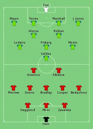 بقي النصف الأول من الوقت الإضافي بالتعادل السلبي، مع استبدال جيوفينكو من Tosaint ريكيتس اثر تعرضه لاصابته بتمزق عضلي. في النصف الثاني، وكان كل من الفريقين استنفدت بدائل المتاحة. في الدقيقة 108th، حارس مرمى سياتل ستيفان فراي جعل حفظ حاسمة على رأس من جوزي ألتيدور ، وذلك باستخدام جسده الربيع يده اليسرى على الكرة. سوف فري تسجيل ما مجموعه سبعة يحفظ وسيطلق عليها اسم اللعبة اللاعب الأكثر قيمة لجهوده.[13] ولفت النصف الثاني من الوقت الإضافي على الانتهاء بعد أكثر من 120 دقيقة من اللعب، مع سياتل فشله في تسجيل طلقة واحدة على المرمى.[10][11]