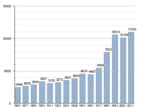في سنة 1861 بلغ عدد السكان 2٬498 نسمة، وتطور العدد ليصل في سنة 2011 لـ 11٬030 نسمة.