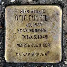مثال على "Stolperstein" (حجر عثرة) في Berlin-Niederschöneweide ، ألمانيا.