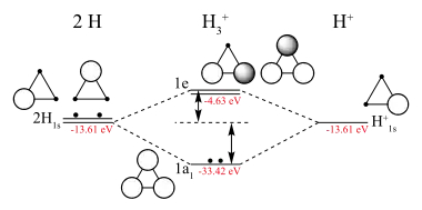 إن ترتيب ذرات الهيدروجين في الجزيء يشكّل مثلث متساوي الأضلاع، ويكون الجزيء في بنية طنينيّة على شكل رابطة ثلاثية المركز ثنائية الإلكترون. وجد نتيجة الحسابات أن لهذه الرابطة قوّة تساوي 4.5 إلكترون فولت، أي ما يعادل 104 كيلو كالوري لكل مول.[13] يعد جزيء كاتيون ثلاثي الهيدروجين مثالاً جيداً لتبيان أهمية عدم تمركز الزوج الإلكتروني مما يمنح ثباتيّة للجزيء.