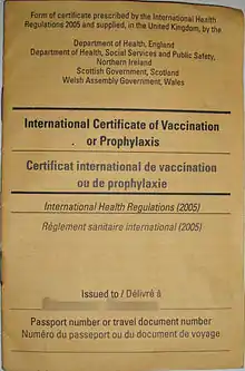 كارتي جون أو البطاقة الصفراء هي شهادة تطعيم دولية، أصدرت من قبل منظمة الصحة العالمية ، و معترف بها دوليا وقد تكون مطلوبة لدخول دول محددة والتي فيها زيادة المخاطر الصحية للمسافرين .[1]البطاقة الصفراء يجب ان تكون محفوظة في جواز سفر صاحبها، لأنها جواز سفر طبي نوعا ما . نلاحظ مثال معروض هنا وهو نسخة أمريكية من هذه الشهادة، صدرت من قبل وزارة الصحة والخدمات الإنسانية الأمريكية . وهي متاحة من خلال مكتب الطباعة الحكومي . الشهادة الأصلية طبعت ونشرت من قبل منظمة الصحة العالمية في نسختين : 1) إنجليزية-فرنسية(ثنائي اللغة) . 2)إنجليزي-فرنسي-عربي(ثلاثي اللغة). نسخ منظمة الصحة العالمية لا تملك صفحات لتعرض موانع استعمال طبية لهذه التطعيمات، التاريخ الصحي الشخصي، الحالة الصحية، العلاجات الطبية، حساسيات معروفة، أدوية متناولة بانتظام، ومعلومات طبيب العيون . هذه النسخ متاحة من قبل مكتبات منظمة الصحة العالمية، ويمكن ترتيبها بكميات تصل إلى 5000 أو أكثر لطباعة فوقية . الجزء الخاص بالحمى الصفراء هو أكثر جزء مهم بهذه الشهادة .المتغيرات الأخرى لشهادة الحمى الصفراء هي صالحة فقط إذا كانت تتبع تنسيقا موحدا وتمت الموافقة عليه رسميا من قبل منظمة الصحة العالمية . كان هناك تنقيح في الشكل والعنوان والقواعد بشأن قضية 2007. إنها تدعى الآن "شهادة دولية أو تطعيم أو وقاية " . ولم تعد خدمة الطباعة الفوقية متوفرة .