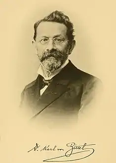 كارل ألفريد ريتر فون زيتل (بالألمانية: Karl Alfred von Zittel) (و. 1839 – 1904 م)[10] هو عالم نبات، وإحاثي، وmalacologist، وأستاذ جامعي من ألمانيا .[11] وكان عضو في الأكاديمية الأمريكية للفنون والعلوم، والأكاديمية الروسية للعلوم، وأكاديمية سانت بطرسبرغ للعلوم، والأكاديمية البروسية للعلوم . توفي في ميونخ[12] ، عن عمر يناهز 65 عاماً.