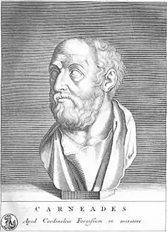 كان كارنيادس من سفسطائيي القرن الخامس قبل الميلاد، وكان الأهم بين الشكوكيين القدماء. ولكن من منظور سلبي، فإن فلسفته جدلية عنيفة وهي مناقضة مع نظرية الرواقيين عن المعرفة بكل أوجهها. ويقول أن كل أحاسيسنا نسبية، وهي تعرفنا فقط بالانطباعات التي تعطيها الأشياء لحواسنا ولا تعرفنا بالأشياء كما هي. ويقول أن الخبرة تظهر بوضوح أنه لا يوجد انطباع حقيقي. وأنه لا توجد فكرة لا تخدعنا؛ ومن المستحيل أن نميز بين الانطباعات السليمة والخاطئة؛ وبهذا فإن الفكر الرواقي عن الانطباعات يجب التخلي عنه. ولذلك فلا يوجد مقياس للحقيقة.