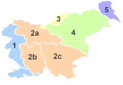 | 1 ليتورال السلوفينية; كارنيولا: 2a كارنيولا العليا 2b كارنيولا الداخلية, 2c كانيولا السفلى 3 كارينثيا السلوفينية; 4 ستيريا; 5 بريكمورجي |
