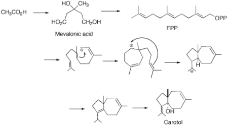 تتم عملية الاصطناع الحيوي انطلاقاً من مركب بيروفوسفات الفارنيسيل (FPP) وفق الآلية المرفقة المقترحة:[4]