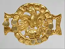 ![]() Clasp with an eagle and its prey found in نهاوند, believed by إرنست هرتسفلد to originally belong to the House of Karen.[1] مشبك مع نسر وفريسته عثر عليه في نهاوند ، يعتقد المؤرخ إرنست هرتسفيلد أنه يعود لعائلة كارين. | |