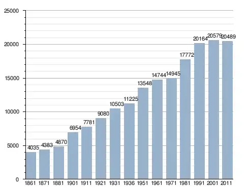 في سنة 1861 بلغ عدد السكان 4٬035 نسمة، وتطور العدد ليصل في سنة 2011 لـ 20٬489 نسمة.