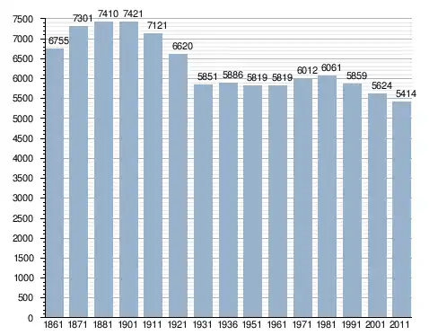 في سنة 1861 بلغ عدد السكان 6٬755 نسمة، وتطور العدد ليصل في سنة 2011 لـ 5٬414 نسمة.