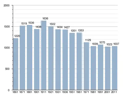 في سنة 1861 بلغ عدد السكان 1٬220 نسمة، وتطور العدد ليصل في سنة 2011 لـ 1٬037 نسمة.