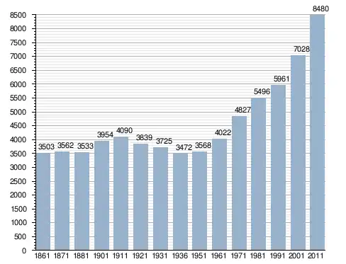 في سنة 1861 بلغ عدد السكان 3٬503 نسمة، وتطور العدد ليصل في سنة 2011 لـ 8٬480 نسمة.