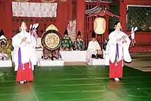 - ميكو كاغورا- رقصات تؤديها عذروات الأضرحة (ميكو) المستمدة أصلاً من الرقصات الطقوسية التي كانت الميكو توجه فيها الكامي، كجزء من رقصات البلاط الإمبراطوري. كانت هذه في الأصل صورة فضفاضة للغاية، تشبه رقصات وطقوس إلهية مماثلة، ولكنها تطورت مع مرور الوقت إلى أشكال ثابتة. أما اليوم، فتتم تأديتها بواسطة الأضرحة والمزارات خلال مهرجان دايجو ساي (大 嘗 祭) أوكعبادة للكامي كجزء من المهرجانات اليابانية أو ماتسوري. كما يؤدينها في المعابد البوذية كأداء للفنون القتالية. وغالبًا ما يتم إجراء هذه الرقصات باستخدام الدعائم الطقسية، مثل الأجراس أو قصب الخيزران أو أغصان الساكاكي أواللافتات الورقية.