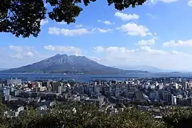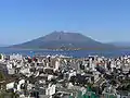 صورة من مدينة كاغوشيما يظهر فيها بركان ساكوراجيما.