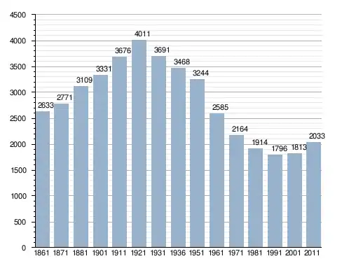 في سنة 1861 بلغ عدد السكان 2٬633 نسمة، وتطور العدد ليصل في سنة 2011 لـ 2٬033 نسمة.