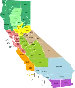 ) هي أكثر ولايات الولايات المتحدة سكانا [5] وثالثها مساحة. تعتبر كاليفورنيا أيضا الكيان النطاقي الثاني من حيث عدد السكان في الأمريكتين، لا تتجاوزها إلا ساو باولو في البرازيل. تقع كاليفورنيا على الساحل الغربي للولايات المتحدة، وتحدها من الشمال ولاية أوريغون ومن الشمال الشرقي ولاية نيفادا وولاية أريزونا من الجنوب الشرقي وباخا كاليفورنيا المكسيكية من الجنوب، والمحيط الهادئ من الغرب. أكبر أربع مدن في الولاية هي لوس أنجلوس وسان دييغو وسان خوسيه وسان فرانسيسكو.[6] يوجد بالولاية ثاني وسادس أكبر مجال إحصائي، وكذلك ثامن مدينة اكتظاظا بالسكان في الولايات المتحدة. تتميز كاليفورنيا بتنوع في المناخ والجغرافيا والسكان.