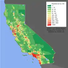 كاليفورنيا هي ثاني أكثر كيان ثانوي اكتظاظًا بالسكان في نصف الكرة الأرضية الغربي، ولا تتجاوزها الا ساو باولو في البرازيل.[14] هناك أربعة وثلاثون دولة في العالم فقط تفوق ولاية كاليفورنيا من حيث عدد السكان.[15][16] مقاطعة لوس أنجلس تحتفظ بلقب أكبر مقاطعات الولايات المتحدة سكاناً لعقود من الزمان وهي وحدها تفوق 42 ولاية أمريكية من حيث عدد السكان.[17][18] مركز ساكنة ولاية كاليفورنيا يقع في بلدة بوتونويل، بمقاطعة كيرن. [ملاحظة 2]
