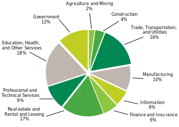 من حيث الوظائف، فإن أكبر خمسة قطاعات وظيفية في ولاية كاليفورنيا هي التجارة والنقل والمرافق العامة والحكومة والخدمات المهنية والتجارية والتعليم والخدمات الصحية والترفيه والضيافة. من حيث الناتج، فإن أكبر خمسة قطاعات هي: الخدمات المالية تليها التجارة والنقل والمرافق العامة والتعليم والخدمات الصحية والحكومة والصناعة التحويلية. ولاية كاليفورنيا لديها حاليا رابع أعلى معدل للبطالة في البلاد يبلغ 9.3 ٪ في ديسمبر 2008 (12.1 ٪ بحلول منتصف عام 2009 والمستمر في الارتفاع) بزيادة كبيرة من 5.9 ٪ في عام 2007.[34]