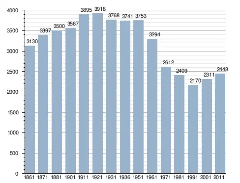 في سنة 1861 بلغ عدد السكان 3٬130 نسمة، وتطور العدد ليصل في سنة 2011 لـ 2٬448 نسمة.