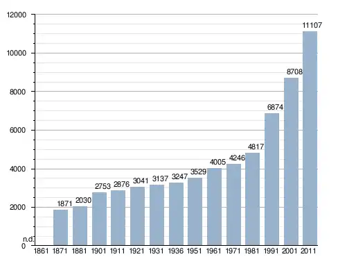 في سنة 1871 بلغ عدد السكان 1٬871 نسمة، وتطور العدد ليصل في سنة 2011 لـ 11٬107 نسمة.