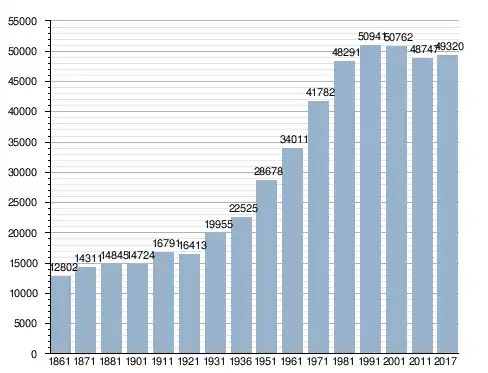 في سنة 1861 بلغ عدد السكان 12٬802 نسمة، وتطور العدد ليصل في سنة 2017 لـ 49٬320 نسمة.