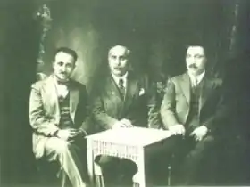 ![]() الإخوة بدرخان، من اليسار إلى اليمين: كاميران (1895-1978)، سرييا (1883-1938)، جلادت (1895-1951). | |