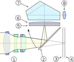 يمر الضوء عبر مجموعة العدسات إلى داخل الكاميرا حيث تقوم مرآة بعكس الاشعة في اتجاه الموشور الذي يقلب الصورة ويصحح مسارها إلى العدسة العينية.