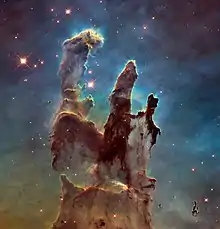 1=صُورة التقطتها مقراب (تلسكوپ) هابل الفضائي التابع لِوكالة ناسا لِإعمدة الخلق، عندما عاود زيارتها. التُقطت هذه الصُورة أساسًا في سنة 1995، ثُمَّ التُقطت صُورة أوضح سنة 2014 تُظهر هذه الأعمدة بِالضوء المرئي..jpg.webp)